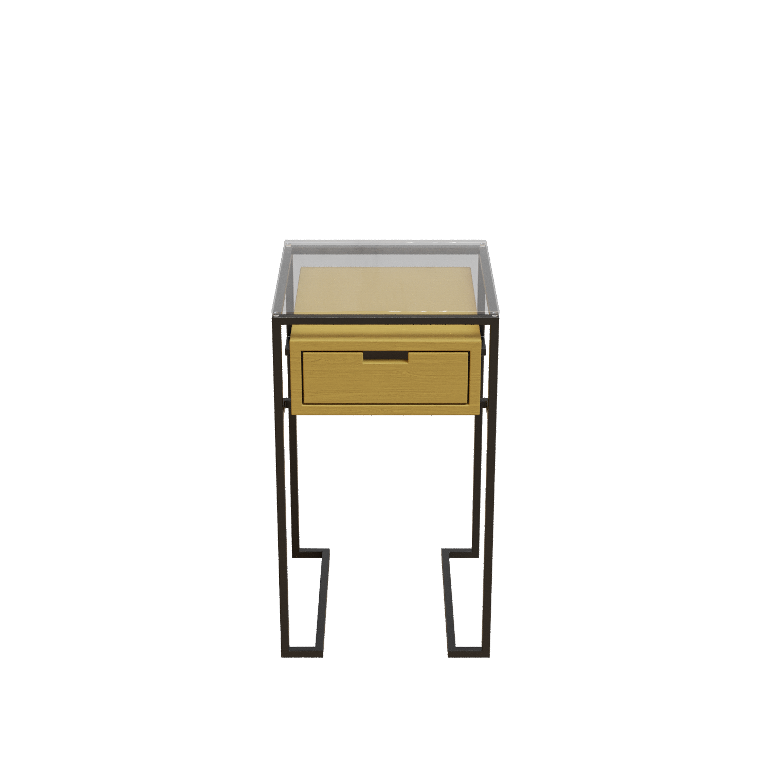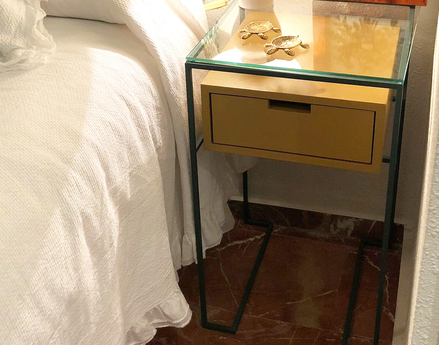 Mesa DrawerDescripción: mesillas de noche con base de vidrio, cajones lacados/pintados y estructura de hierro lacado.Dimensiones:40 x 40 x 70 cmTiempo estimado de entrega 2-3 semanas