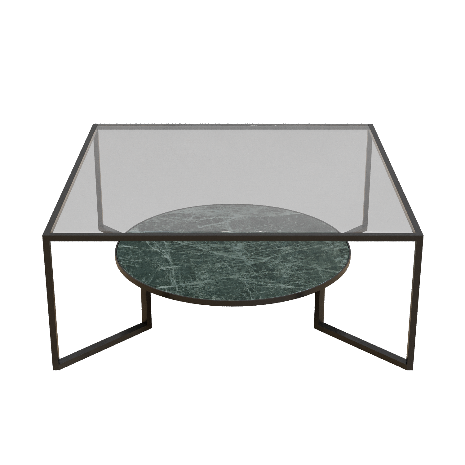 Mesa GeometryDescripción: mesa de centro exterior o interior con base de vidrio y mármol verde guatemala y estructura de hierro en negro mate.Dimensiones:120 x 120 x 50 cmTiempo estimado de entrega 2-3 semanas